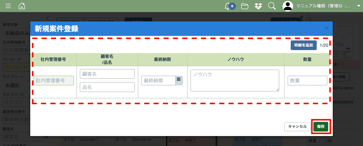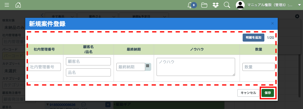 案件の登録画面が表示されますので、必要な情報を入力して「保存」ボタンを押してください。