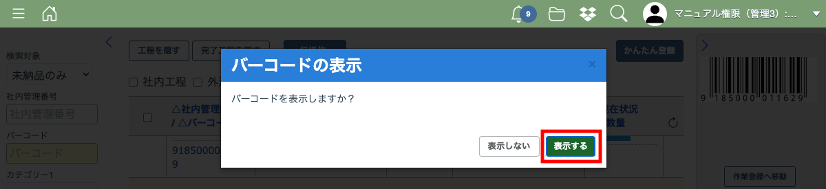 バーコードの表示についての確認画面が表示されますので「表示する」ボタンを押してください。
