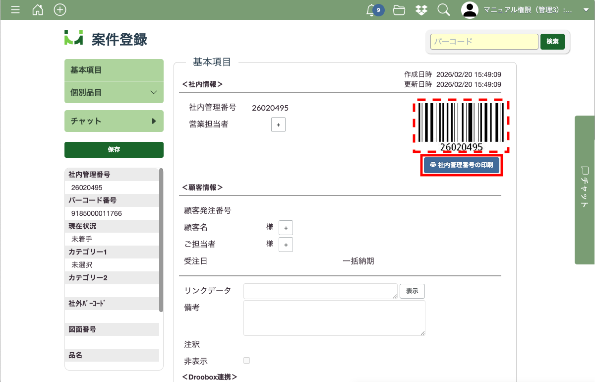 保存が完了すると、基本項目の右上に社内管理番号のバーコードが表示されます。