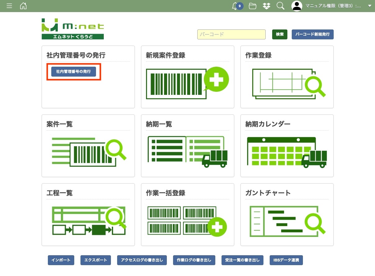 - メニュー画面で社内管理番号発行ボタンを押して発行